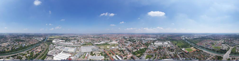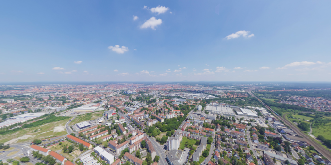 Dazu gingen wir mehrere Wege: einmal das Bild mit „Tiefblick“, wie oben zu sehen. Dann weitere Standpunkte mit voll-sphärischer Abbildung. Schließlich noch ein hochauflösender Rund-Um-Blick von der obersten Frei-Plattform des Turmes mit knapp 50.000 Pixeln Breite.